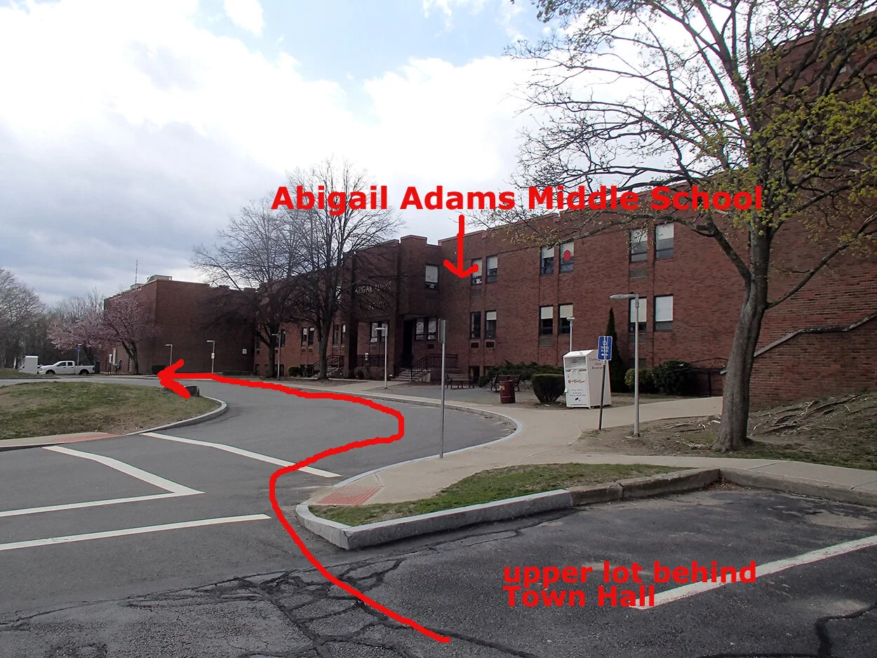 Turn left into the upper Town Hall lot, left down the Abigail Adams School driveway, left onto Middle Street in front of Town Hall, left onto Academy. Rinse and repeat 3 times