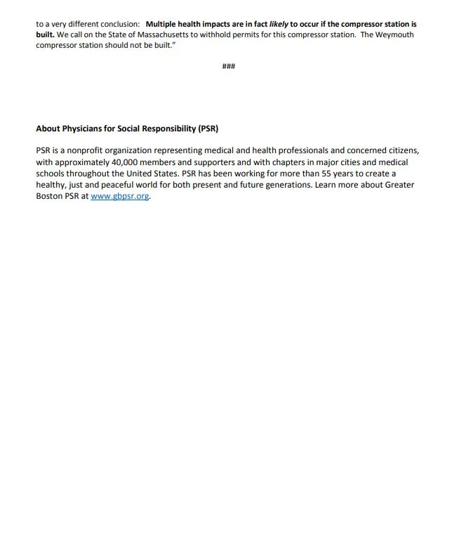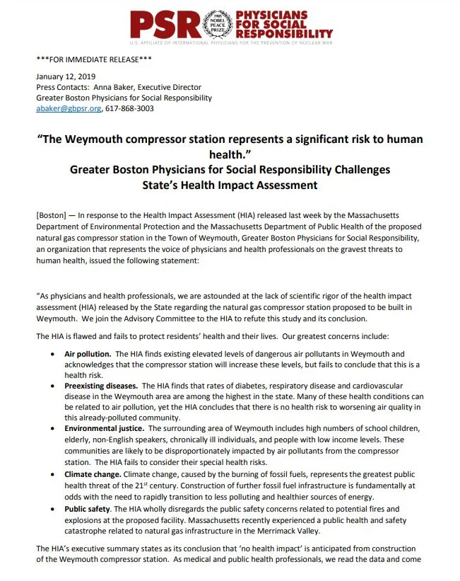 /The Greater Boston Physicians for Social Responsibility released a response to MassDEP’s and MAPC’s Health Impact Assessment. They state that ‘“The Weymouth compressor station represents a significant risk to human health.”’ We thank them for voicing their concerns about this invalid, destructive HIA.